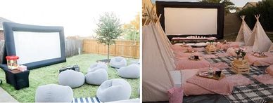 How exciting it is to have a movie night in your own backyard? Choose between a 14-Ft, 16-Ft, or 20-Ft inflatable screen, which comes with the projector, projector stand, sound bar / speakers, and various seating options!